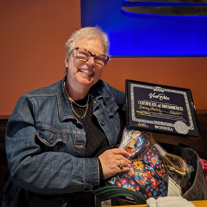 Congratulations to our newest Viva Babe, Avaloy! While enjoying a delicious beet salad at Roots, her daughter Aubrey excused herself to grab something from the car. To Avaloy's surprise, Aubrey returned with a large pink bag, surprising her with the Viva Babe Award! She was blown away as the Consuela bags' vibrant colors are a joyful reminder of her hometown in Texas.