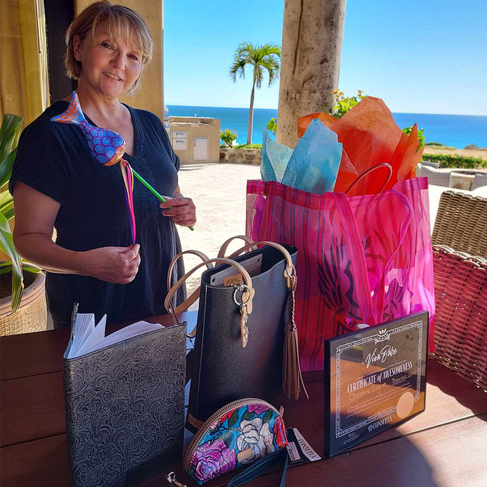 Christine's dedication has not gone unnoticed, as she was nominated for the Viva Babe award by her close friend, Kim. During their recent girlfriends' vacation in Cabo, Christine was surprised when they presented her with the Viva Babe award and Consuela bags before lunch. It was such a joyful and memorable moment. It's a testament to Christine's impact and the love and appreciation she inspires in those around her.