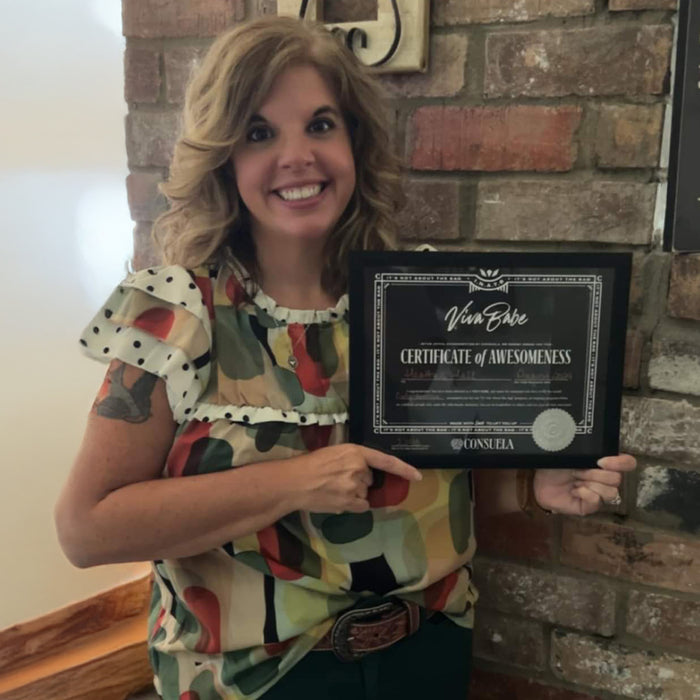 Congratulations to our newest Consuela Viva Babe, Heather! After a long, challenging day, her husband Cody had a surprise waiting and asked her to stop by their home before heading out for a well-deserved margarita. With her eyes closed, Heather opened them to see the Viva Babe certificate and gifts before her. “My breath was taken away,” she said, as Cody’s heartfelt nomination beautifully reflected her incredible spirit.
