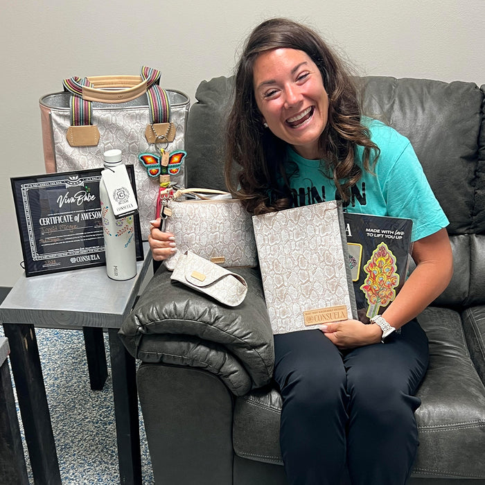 Congratulations to our newest Viva Babe, Ingrid! During a special moment in the library, while preparing food boxes for families with her husband and friends, Ingrid was surprised when her husband, Ted, presented her with the Viva Babe Award.