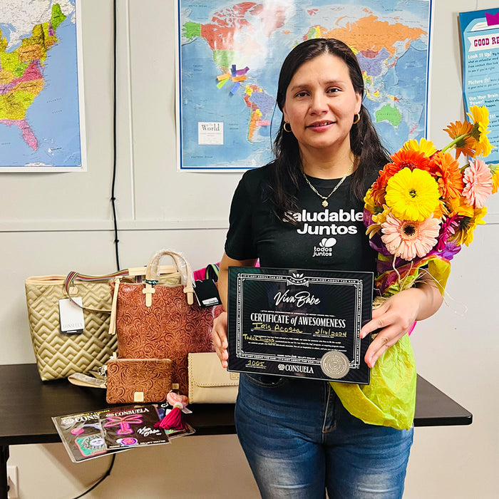 Join us in celebrating the incredible Iris, our newest Viva Babe! Iris's journey is inspiring and filled with dedication, resilience, and boundless compassion. As she gracefully accepted the Viva Babe award, Iris expressed her heartfelt gratitude to the Todos Juntos Learning Center team for nominating her for this honor. "I felt so surprised; the bags are beautiful – it is the celebration moment that will forever stay with me. You all made me feel very special," she shared, reflecting on the joyous occasion.