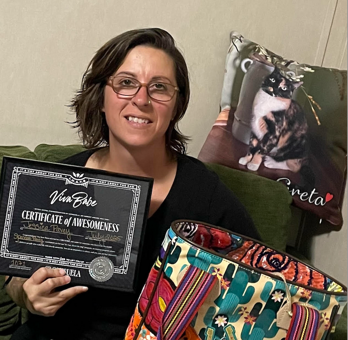 When surprised with the Viva Babe Award, Jessica said, “It’s so seldom you get recognized and receive gifts. The recognition and the generosity floored me.” She is overjoyed to have a new Dezi Classic Tote to carry her school supplies and essentials after losing her previous one in the fire.