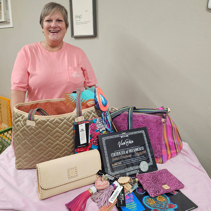 Celebrating our newest Consuela Viva Babe, Karen! While volunteering at her daughter Hannah’s office recently, Karen was asked to call before arriving—an unusual request. Little did she know, a heartwarming surprise awaited her. As she walked in, Hannah presented her with the Consuela Viva Babe Award, leaving her stunned!