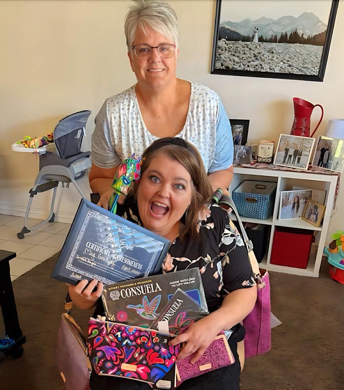 Meg and Jenn’s friendship has blossomed over the last 15 years, without missing a beat while they have lived more than 1,200 miles apart. This strong bond led to an unforgettable surprise. On Jenn’s behalf, Meg’s best friend Joni and her kids gathered to happily present her with the Viva Babe Award and gifts. “I was so surprised,” Meg shared. “Everything was perfect—just the accessories and bags I would have picked for myself and in my favorite colors!”