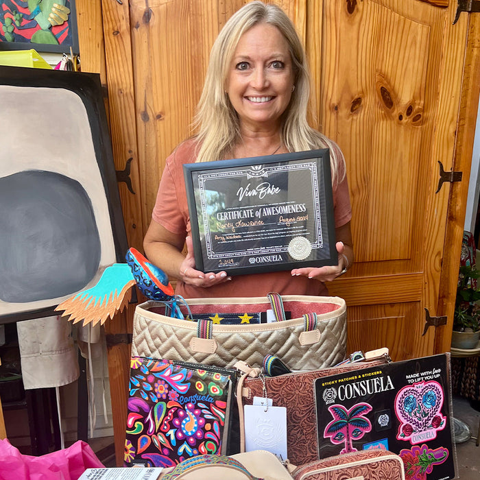 Congratulations to our newest Consuela Viva Babe Nancy! What started as a simple coffee date turned into an unforgettable surprise for Nancy! Her dear friend, Amy, arrived with a big pink bag and exciting news—she had nominated Nancy for the Consuela Viva Babe Award! The moment was surreal, filled with happy tears, laughter, and pure joy. Nancy proudly displays her Awesomeness Award in her home art studio, where she creates, dreams, and inspires.