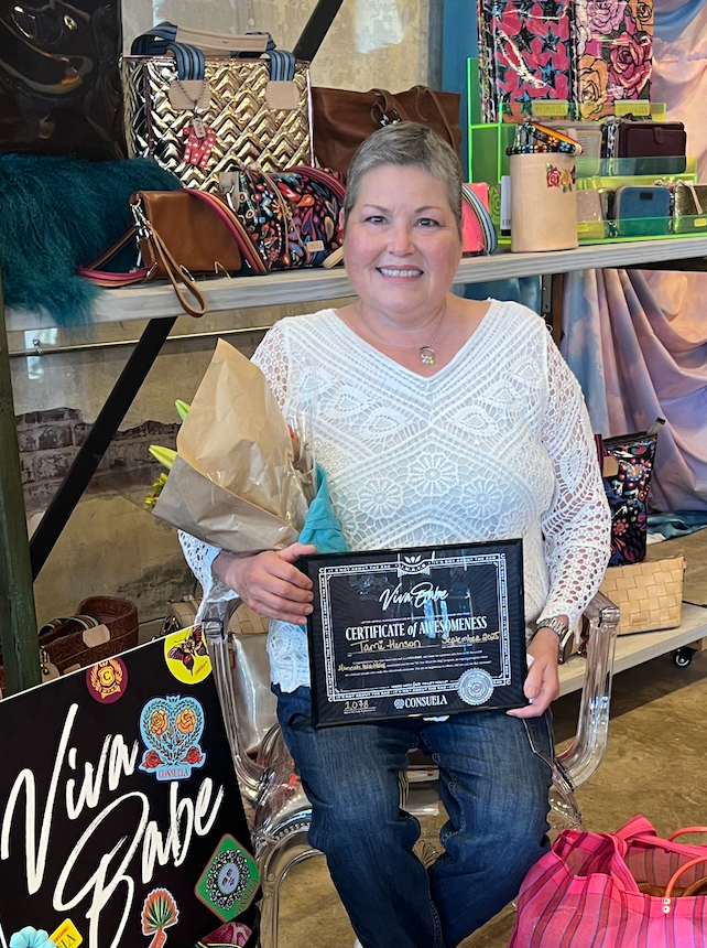 Her celebration was as heartfelt as she is. Tami thought she was meeting her family at the Smithville Consuela store for lunch nearby, but instead, Hannah and the team surprised her with flowers, gifts, and the Viva Babe Award. “I was so shocked… what a blessing,” Tami said. “It lifted me up, especially right before my surgery. I couldn’t believe it.”