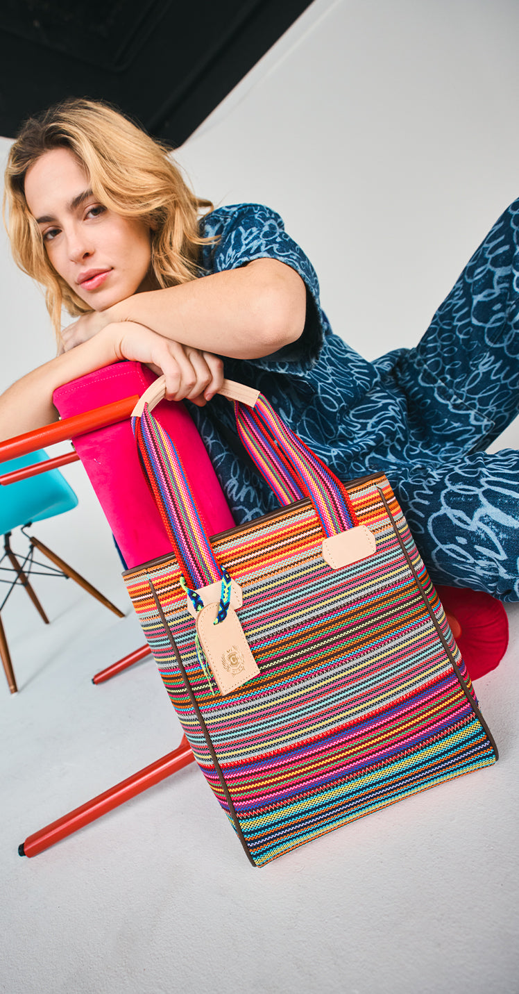 The Chica Tote is the smaller version of our signature Classic Tote. With a slim silhouette perfect for life-on-the-go, the Chica carries all you need with ease. Topped with comfortable woven handles, this multi-functional tote is trimmed in natural leather and crafted to hold its shape. Our tote features a roomy interior and pockets.