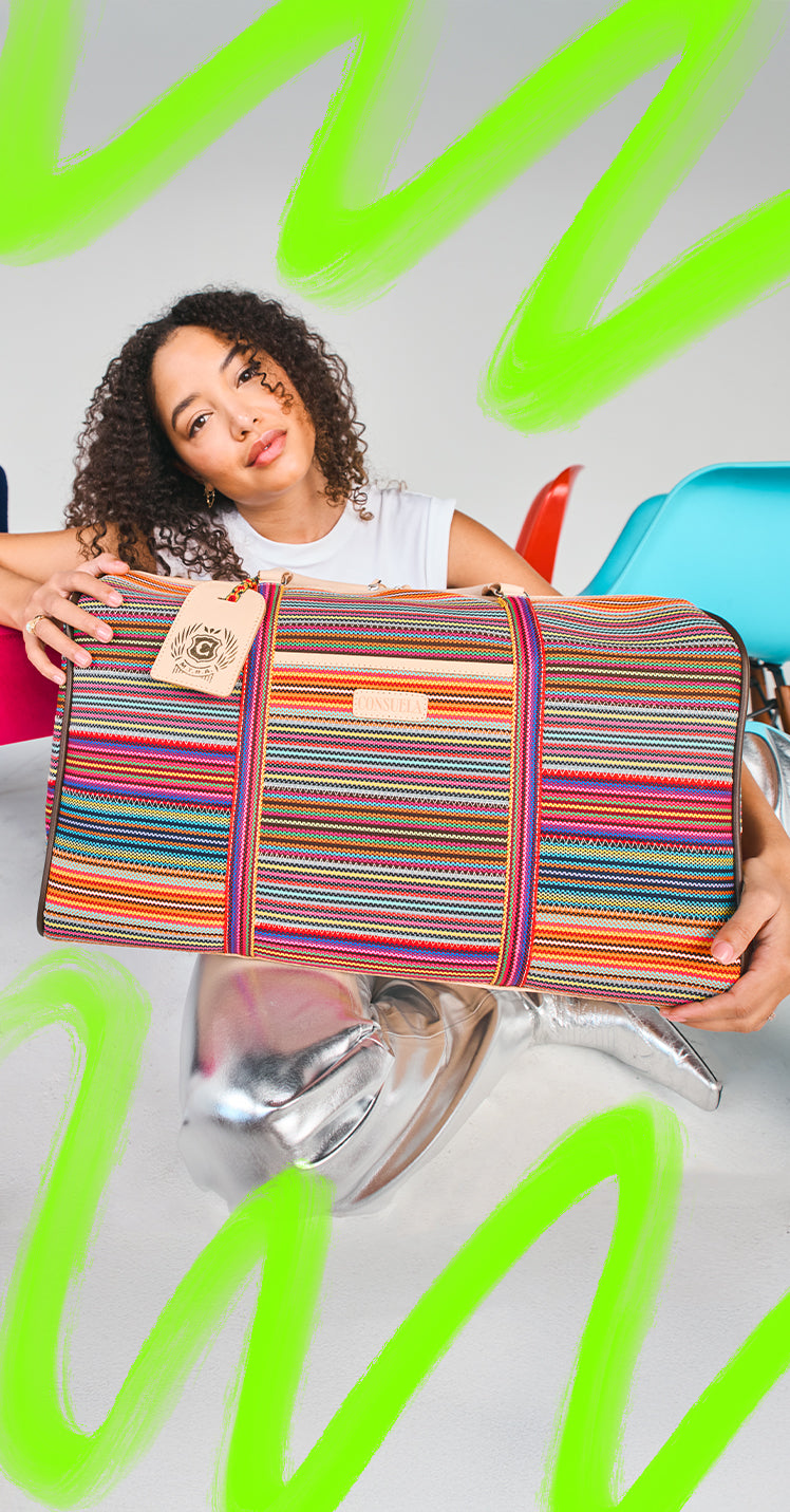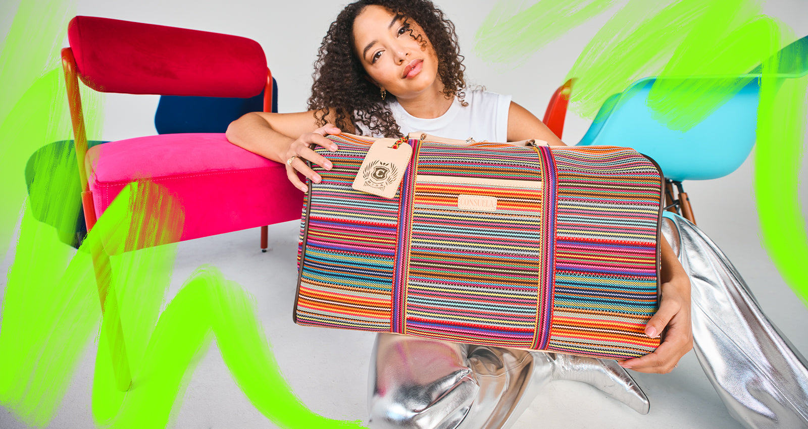 Our largest duffel style, the Weekender, is our go-to for weekend road trips. This leather duffel bag is roomy enough for all your essentials and features leather handles, an adjustable webbing strap, two interior pockets, and two exterior pockets. If you’re looking for a TSA carry-on compatible bag, check out the Jetsetter or the Zipper Tote!