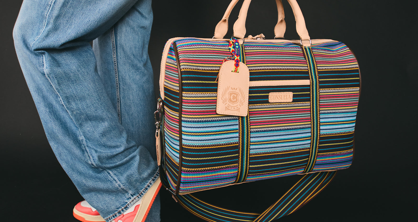 - Natural leather handles and multicolored, woven, adjustable crossbody shoulder strap