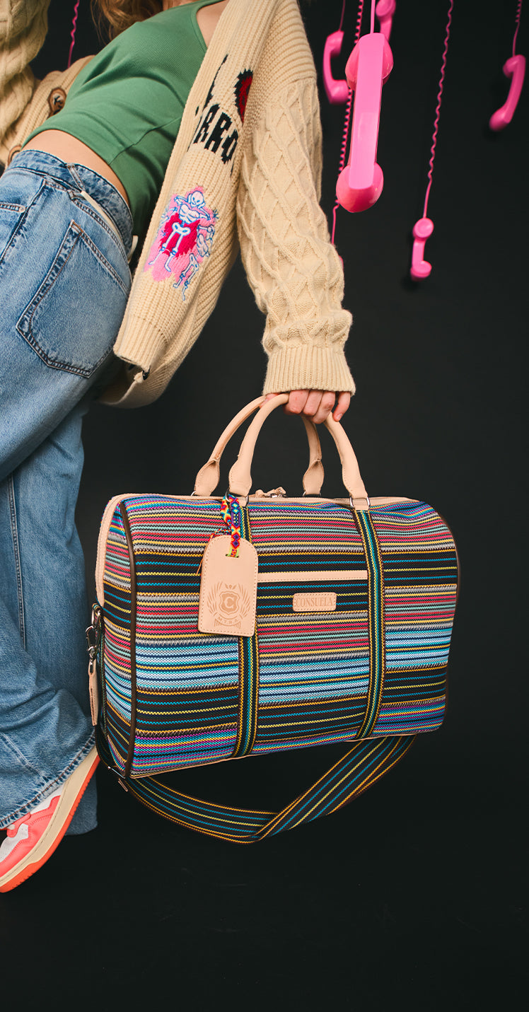 This spacious and colorful duffel is the perfect carry-on for a weekend getaway, making a statement with functionality, durability, and style. Topped with natural leather handles and an adjustable webbing strap, the Jetsetter is crafted to hold its shape and makes traveling easy with ample interior storage and functional pockets.