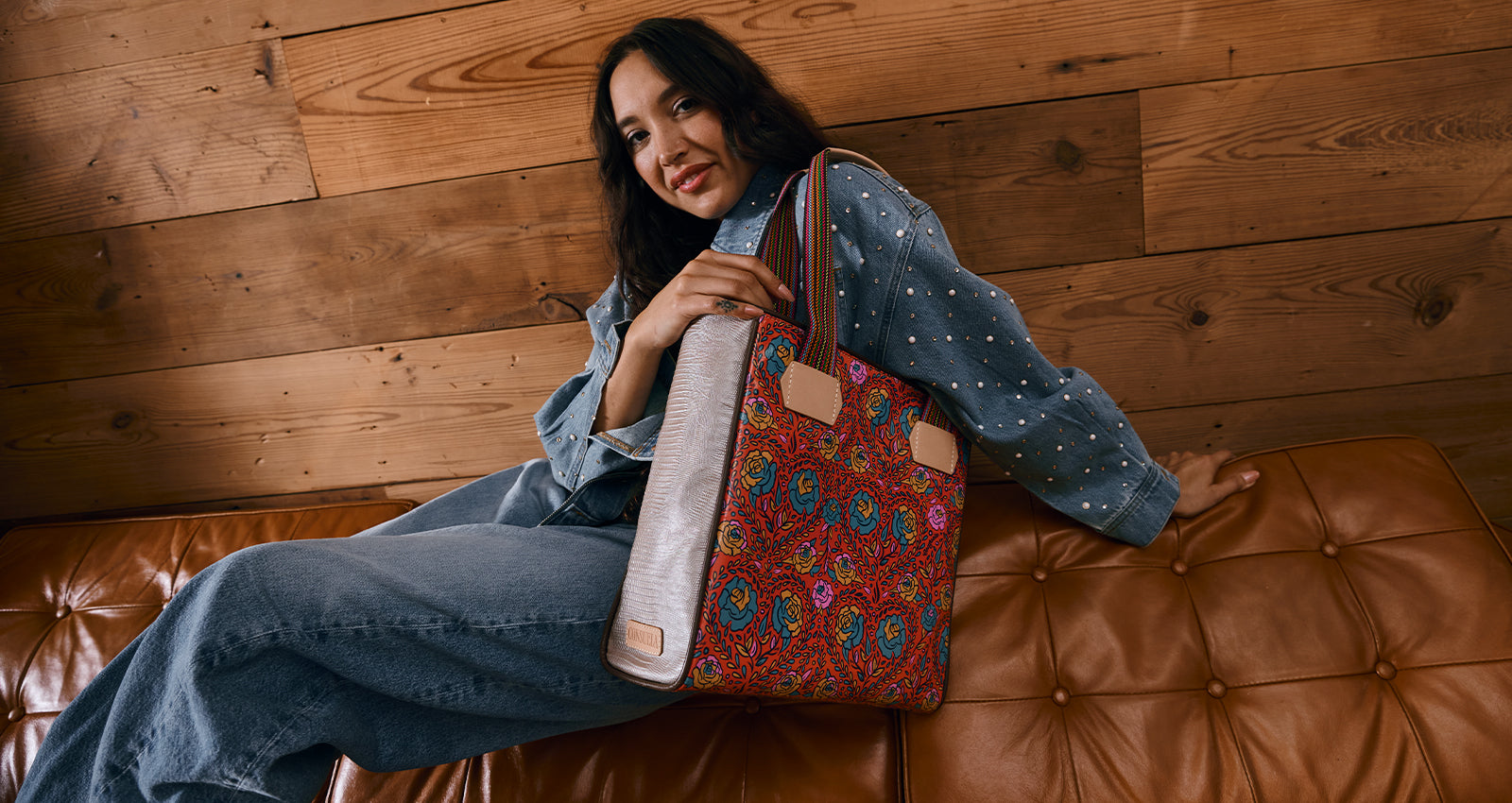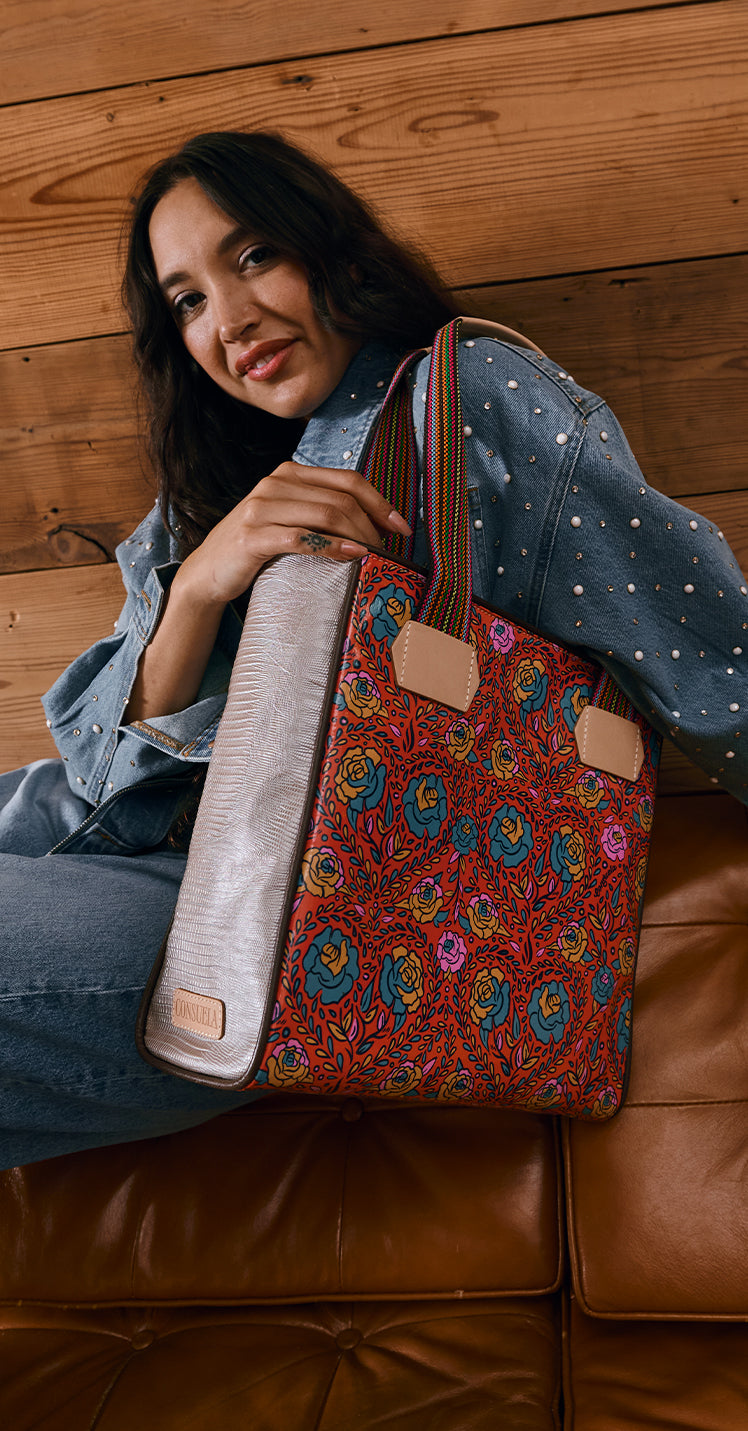 The Consuela x James Avery collaboration Classic Tote features a custom collaboration print that reimagines Consuela’s iconic rose motif in James Avery’s signature coral hue, with James Avery’s fuego logo seamlessly woven into the pattern. Hand-drawn to echo the look of metal engraving, the print beautifully blends the visual identities of both brands.This colorful tote bag holds its shape while carrying all the essentials in the durable and easy-to-clean ConsuelaCloth™. The interior has a slide pocket and zipper pocket, keeping smaller items secure and easily accessible. Colorful woven straps are trimmed in natural, untreated leather for a comfortable fit.