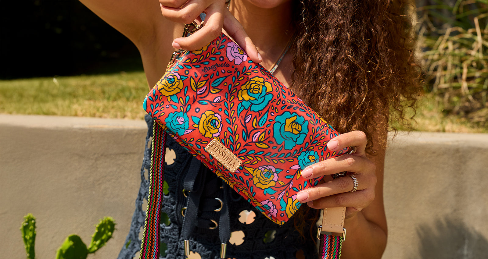 The Consuela x James Avery collaboration Uptown Crossbody features a custom collaboration print that reimagines Consuela’s iconic rose motif in James Avery’s signature coral hue, with the James Avery’s fuego logo seamlessly woven into the pattern. Hand-drawn to echo the look of metal engraving, the print beautifully blends the visual identities of both brands . This colorful crossbody bag has three zipper compartments, six card holder slots, a double magnetic closure and an included crossbody and wristlet strap. In the durable and easy-to-clean ConsuelaCloth™, this wipeable material is ready to keep up with you and your adventures.