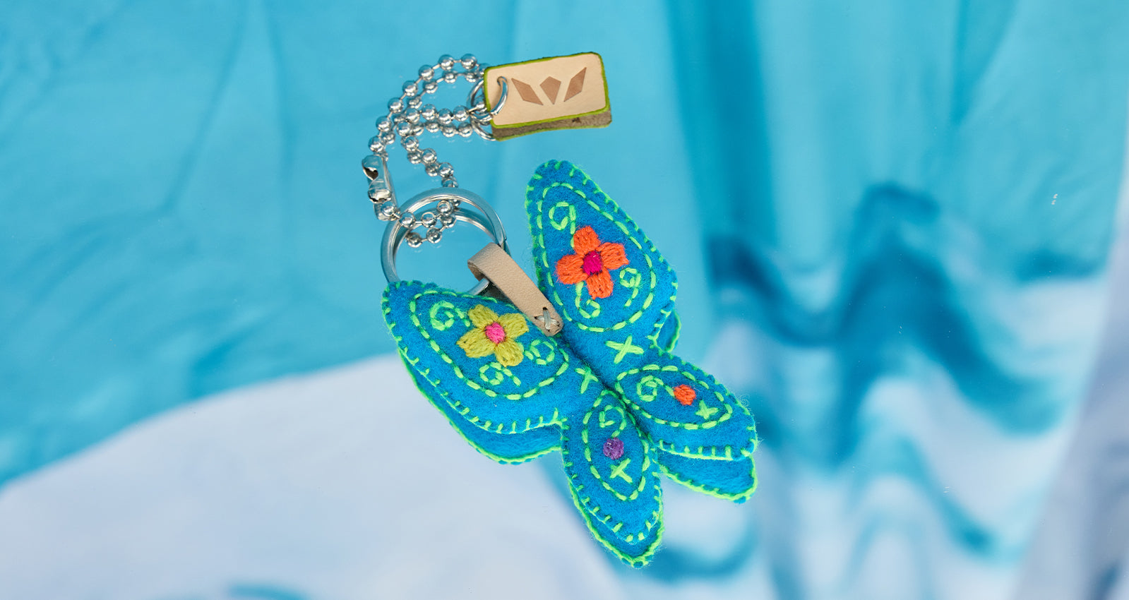 - Hand-embroidered floral on a blue felt mariposa