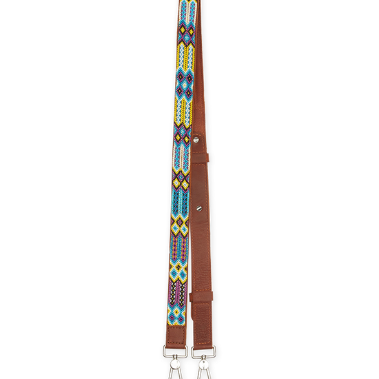 Create your own unique look with our Blueberry Crossbody Strap featuring colorful handwoven bracelets on soft dark brown leather.