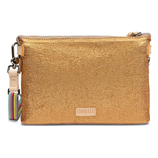 - 8 ¼" (W at the base), 9 ¼” (W at the top) x 5 ¾” (H) x 2" (D), 14 ½”-27 ½” adjustable crossbody strap drop