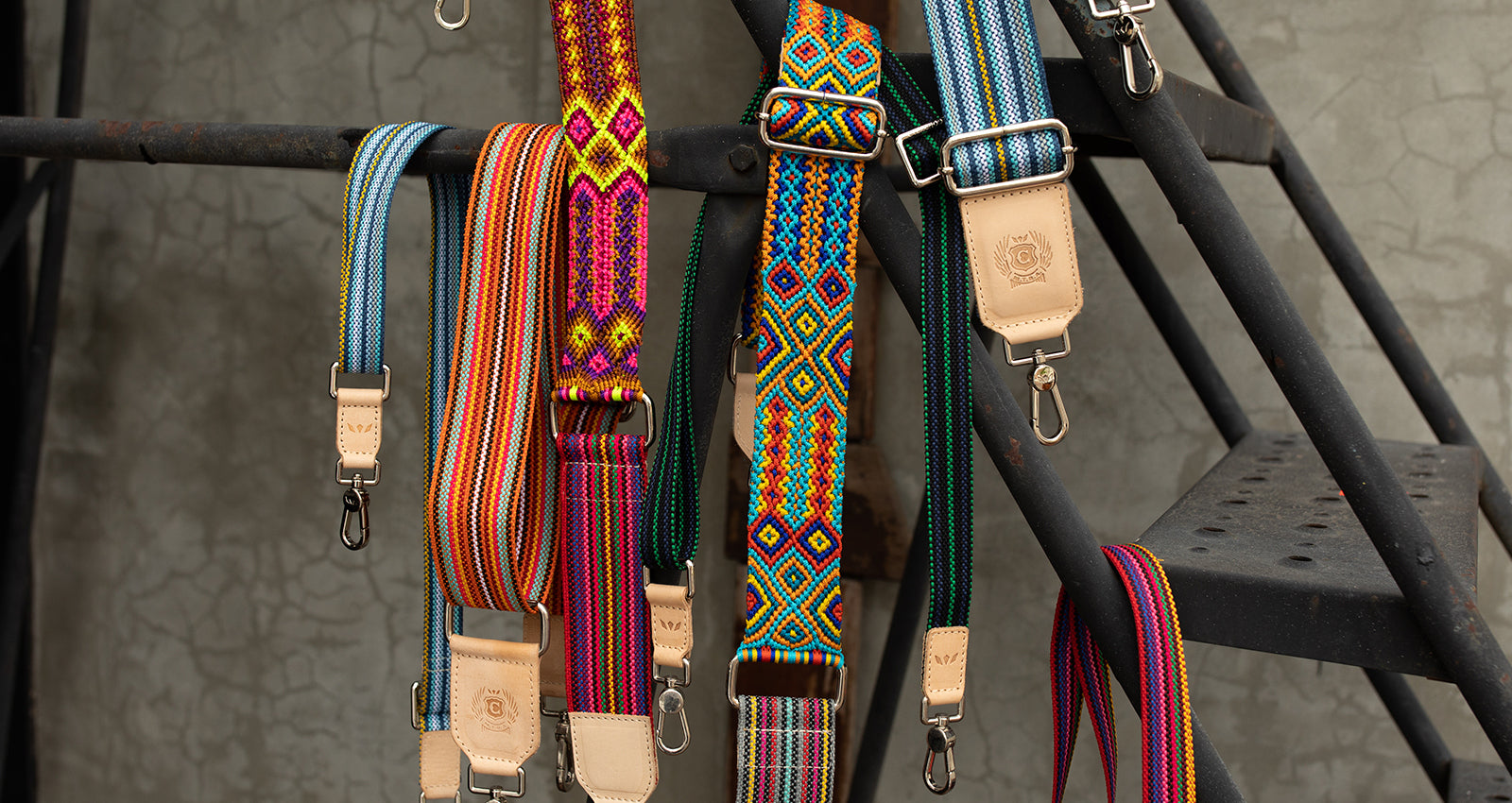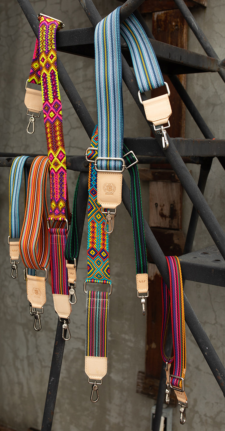 Create your own unique look with our Bubbles adjustable Crossbody Strap. This woven crossbody strap is trimmed in natural, untreated leather and accented with our colorful friendship bracelet embroidery. This is the perfect customized addition to any of our convertible bags: the Downtown Crossbody, Hobo, Sling, or Wedge.