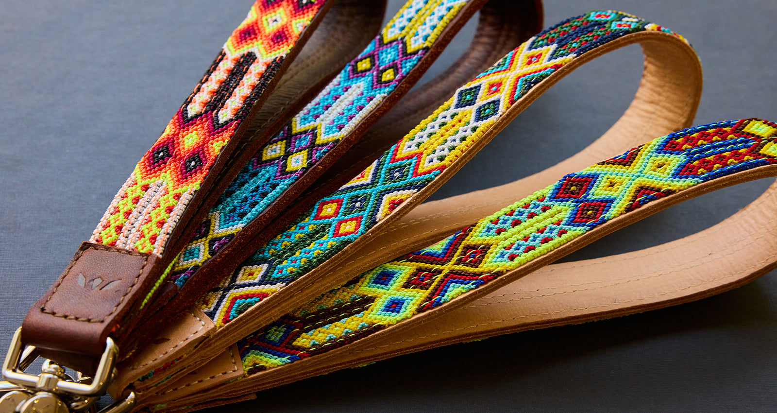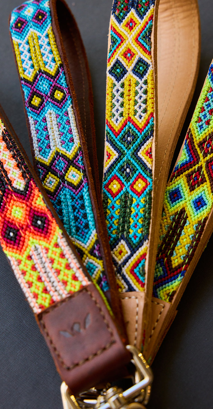 Create your own unique look with our Citrus Wristlet Strap featuring colorful handwoven bracelets on natural leather.