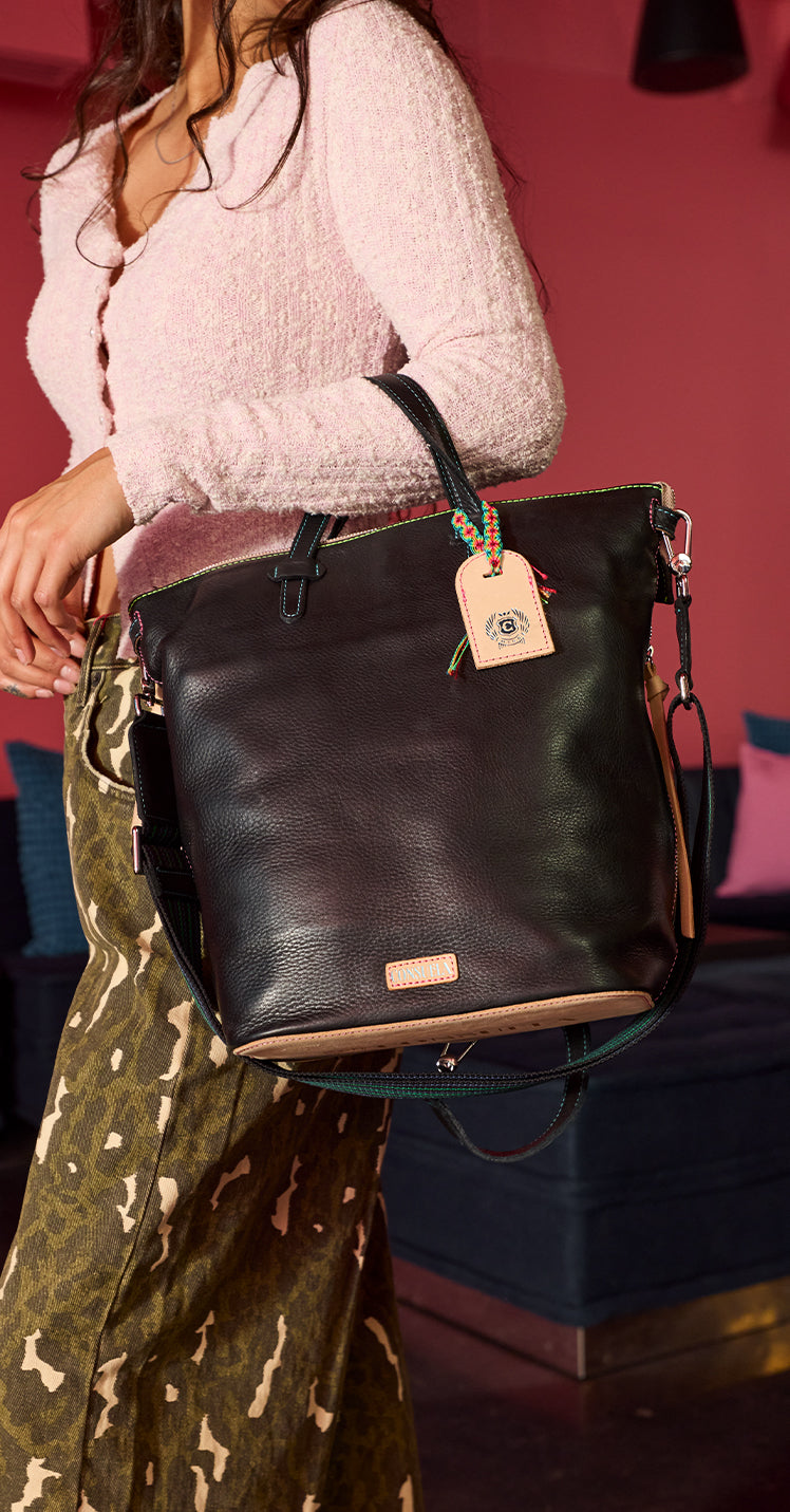 - Cyndi black pebble leather exterior, handles, and trim