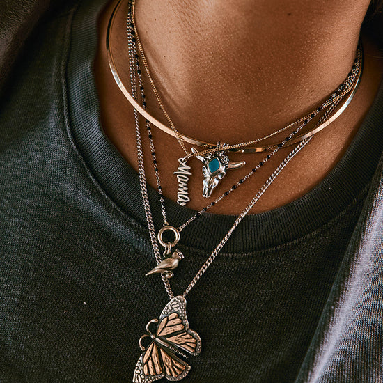 An updated interpretation of our Desert Rose Charm, this sterling silver pendant exudes both strength and beauty. Inspired by America's Southwest, the buff top gemstone in the center of the cow's forehead adds a dash of bold elegance while the sun-bleached skull and roses in full bloom symbolize the balance of masculine and feminine. This unisex design makes a striking statement on a chain necklace and pairs well with many of our other Southwestern collection items.