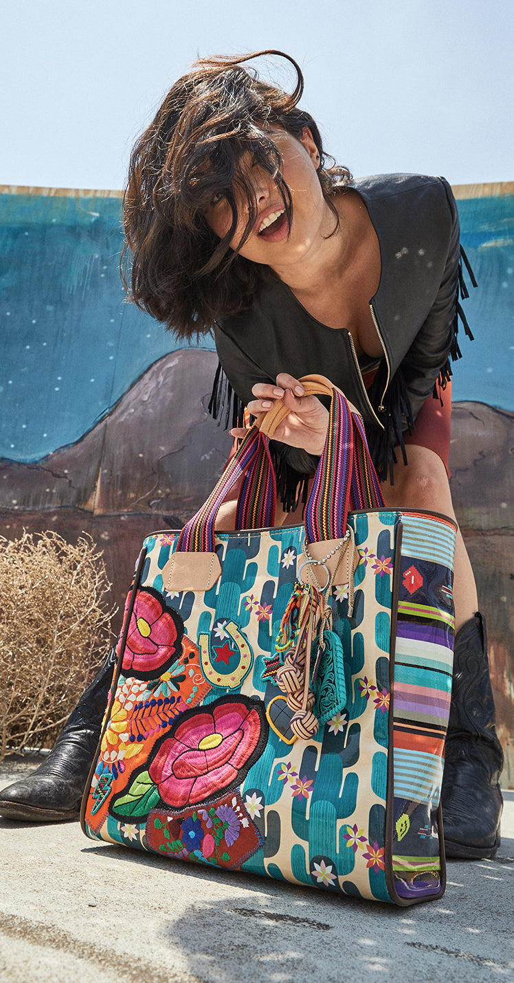 Our Dezi Classic Tote is perfect for life-on-the-go and it packs a statement. The vibrant embroidered patches, contrasting side panels, and handmade charms make it a Consuela classic. Topped with comfortable woven handles, this multi-functional tote is trimmed in natural leather and crafted to hold its shape. Our tote features a roomy interior and pockets; ideal for carrying your laptop, keys, and phone.
