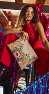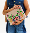 The Take Me Out Clutch was made to stand out! This unique pouch can be carried as a colorful clutch or stashed in a larger bag for stylish organization. This embroidered zipper pouch is large enough to fit most tablets, notebooks, and up to a 12” laptop.