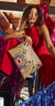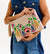 - Neutral textured exterior with colorful, embroidered sunset motif and Austrian crystal detail