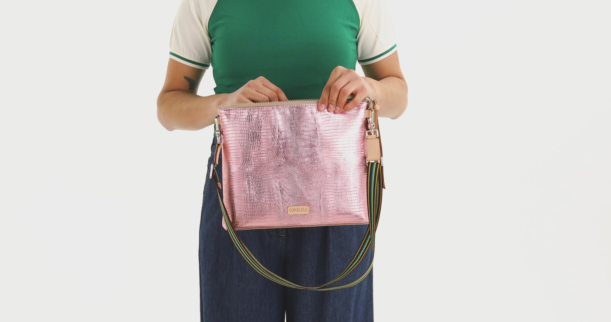 - Includes detachable and adjustable woven crossbody strap