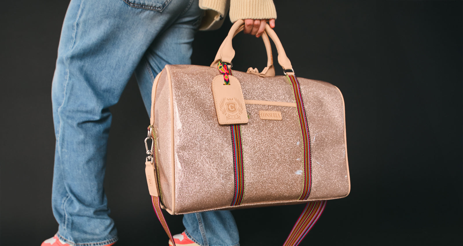 - Natural leather handles and multicolored, woven, adjustable crossbody shoulder strap