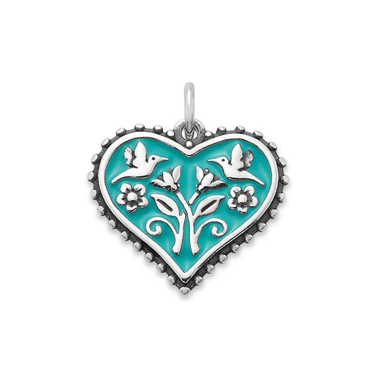 Aflight on a colorful heart-shaped backdrop, two folk-art-inspired hummingbirds seek nectar from stylized flowers.