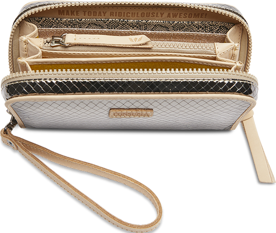 This accessory is functional for everyday use on its own or great for organization inside a larger bag. The Wristlet Wallet expands when unzipped to allow ample space for card organization and can be held by the included wristlet strap.