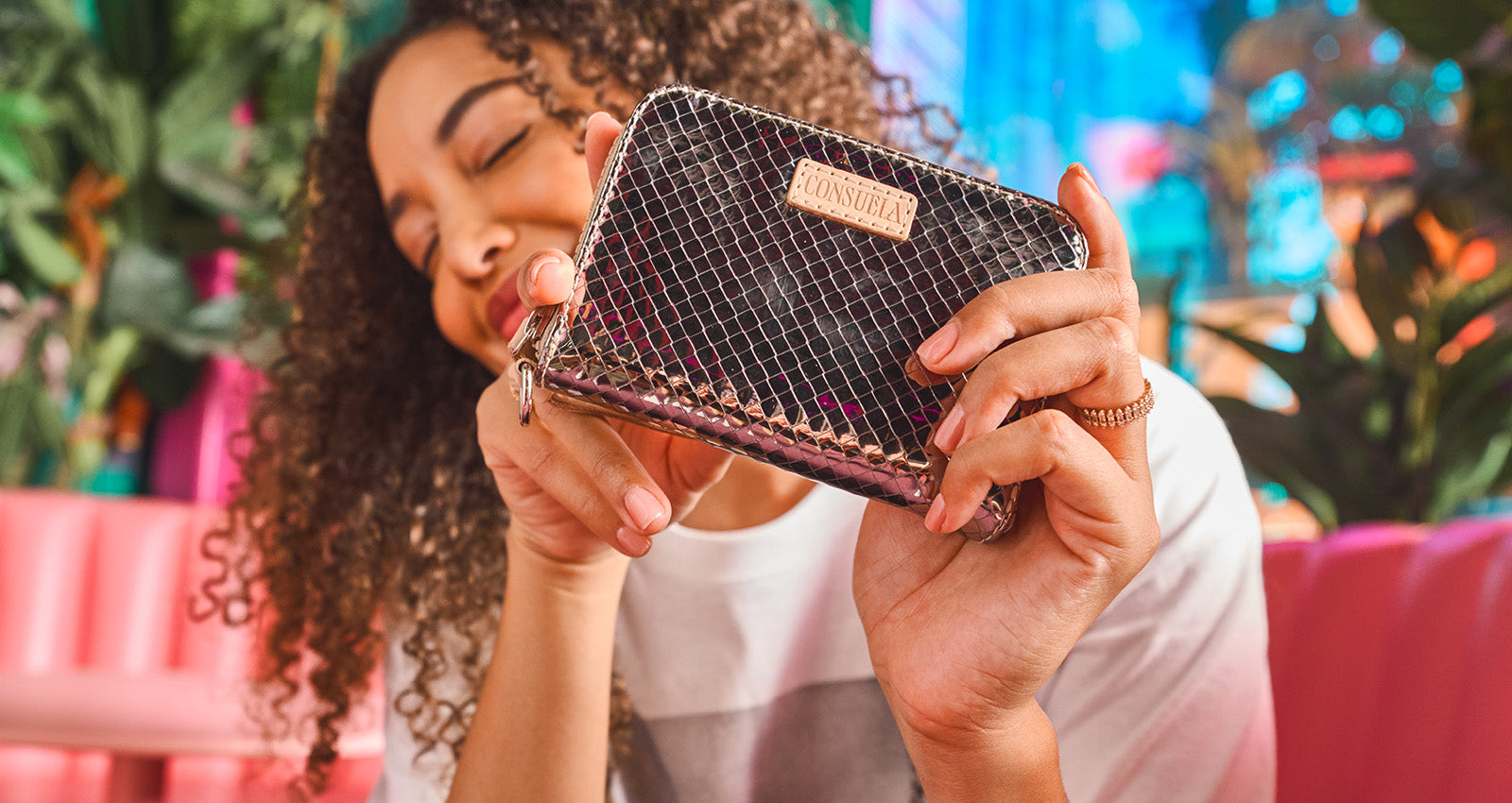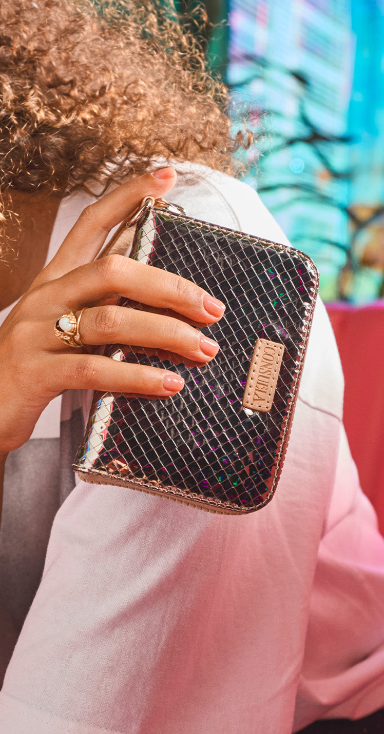 Say hello to Zippy, our newest wallet. This small, but mighty companion has both interior and exterior card slots with a zip closure. Use the D-ring to securely attach Zippy to your bag lanyard or combi wristlet.