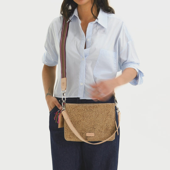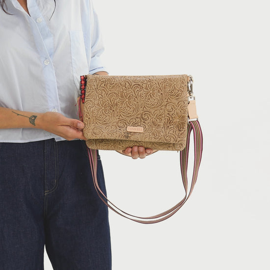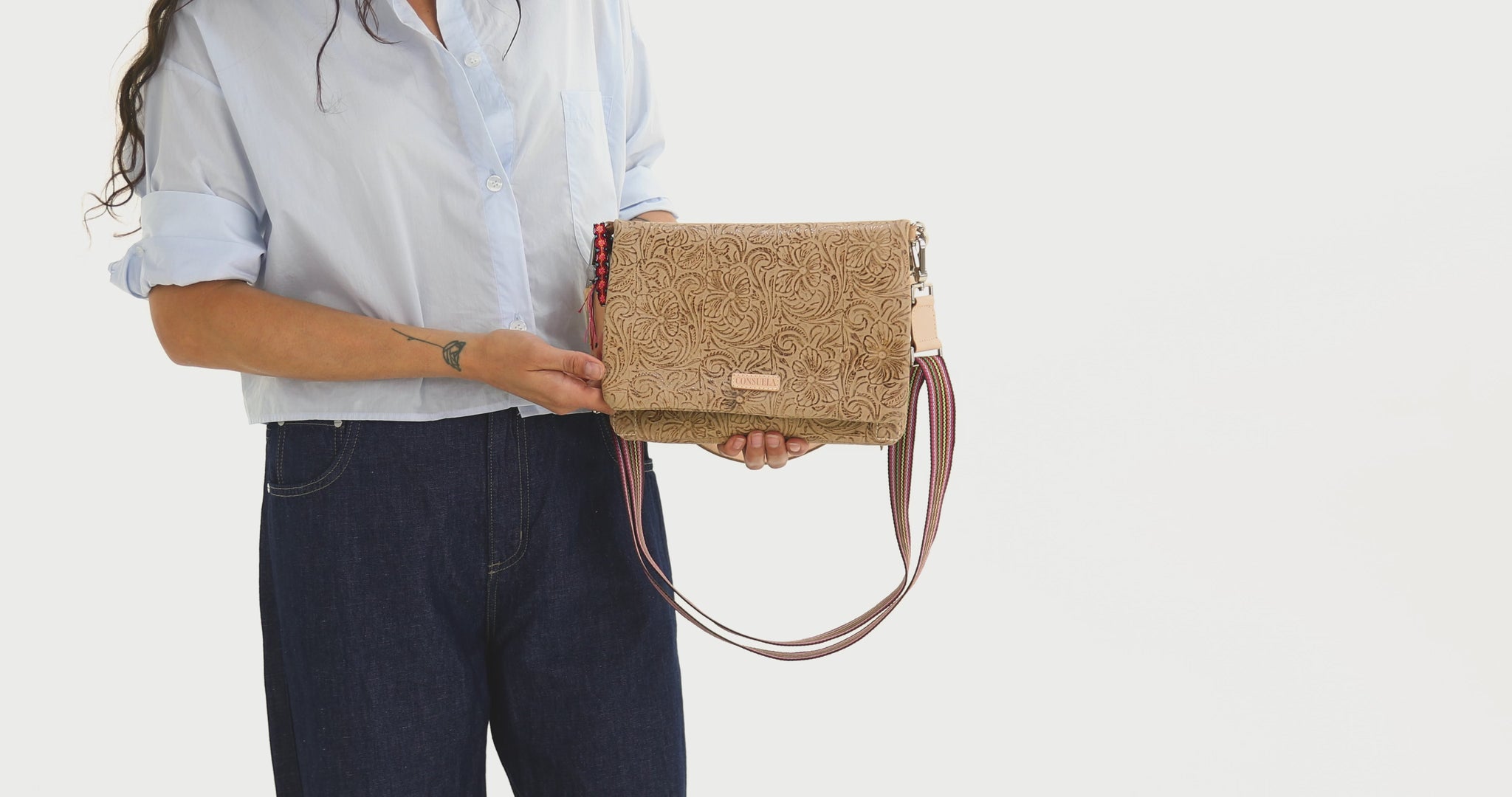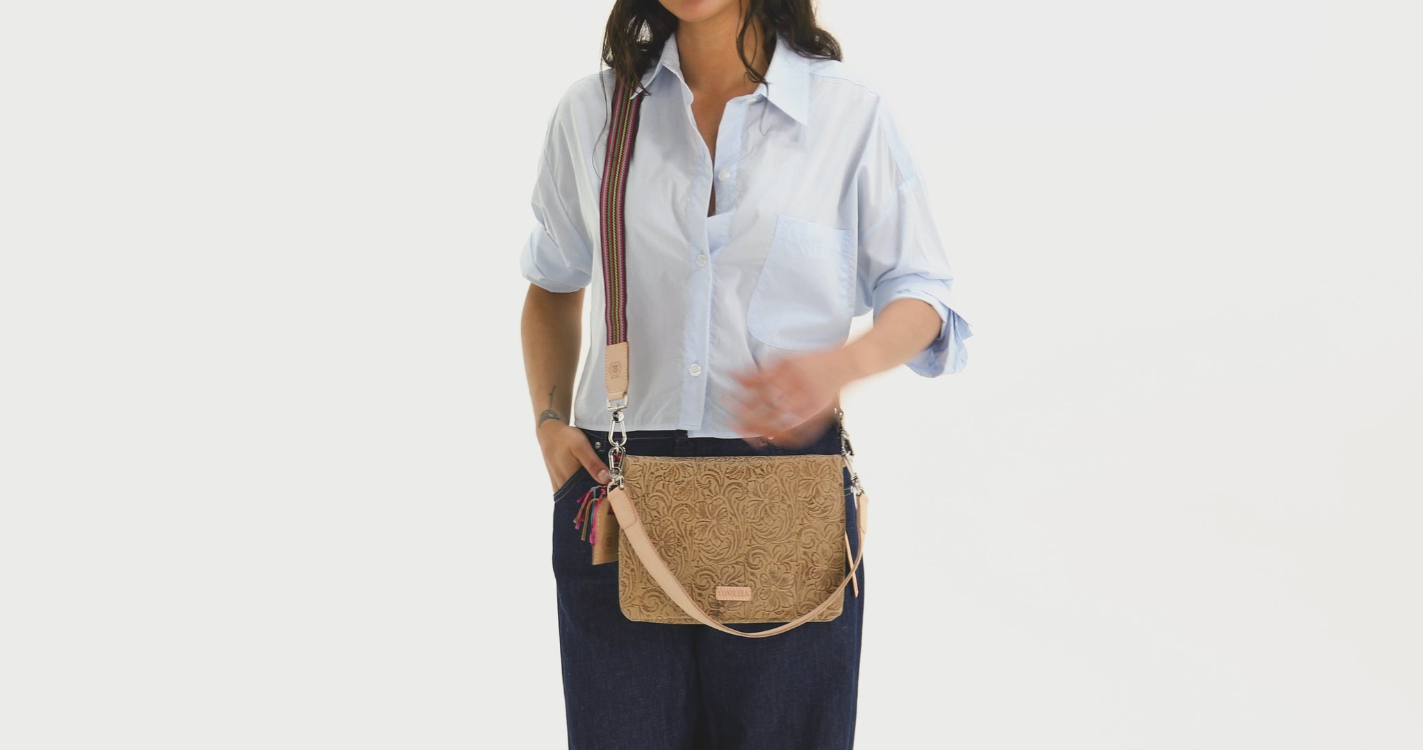 - Included detachable shoulder strap and adjustable woven crossbody strap
