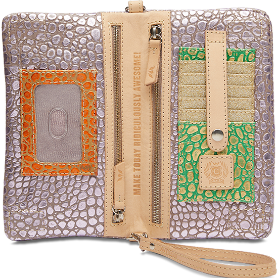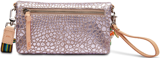 - Included detachable wristlet strap and adjustable woven crossbody strap