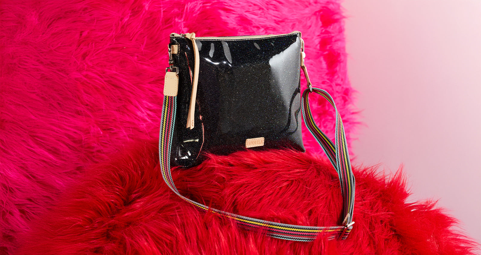 - Includes detachable and adjustable woven crossbody strap