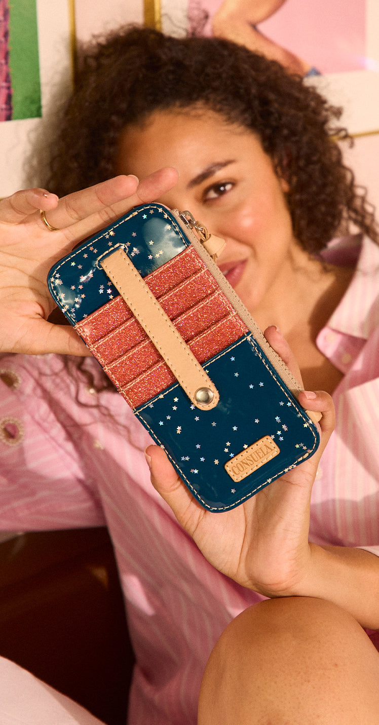 Keeping things light and easy, the card organizer is perfect for credit cards and folded bills. This leather wallet’s snap-closure and zipper compartment provides security while you take on the day.