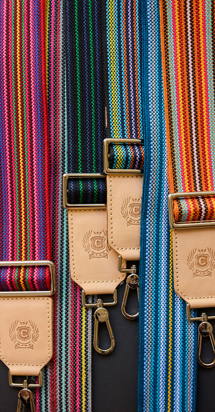 Create your own unique look with our Crossbody Straps.  This woven crossbody strap is trimmed in natural, untreated leather.  Perfect for adding a colorful accent to any of our convertible bags: the Downtown Crossbody, Hobo, Sling, or Wedge.