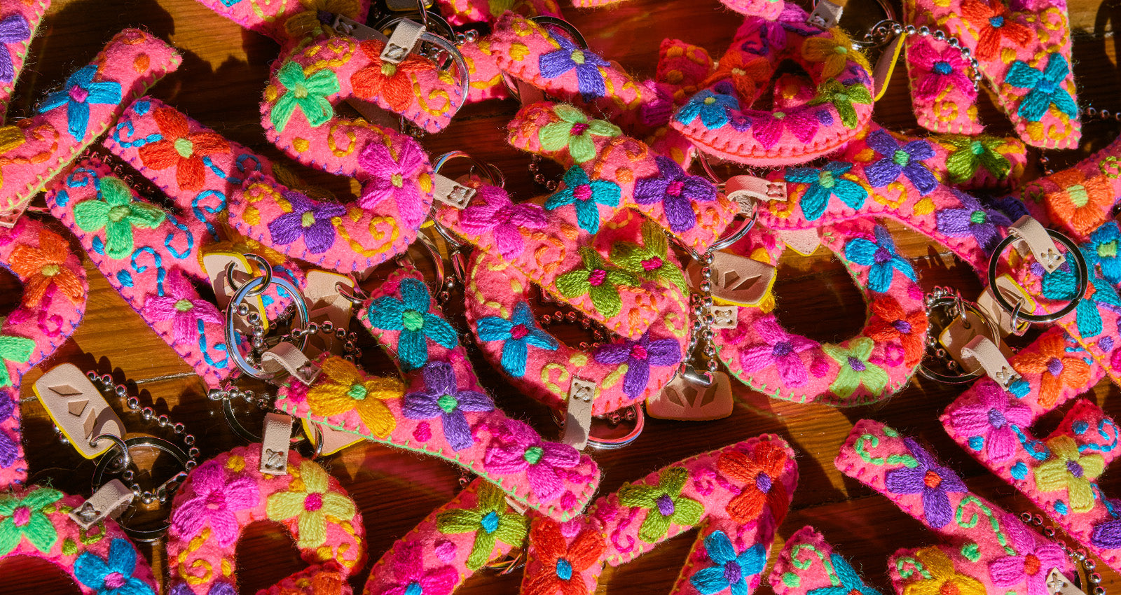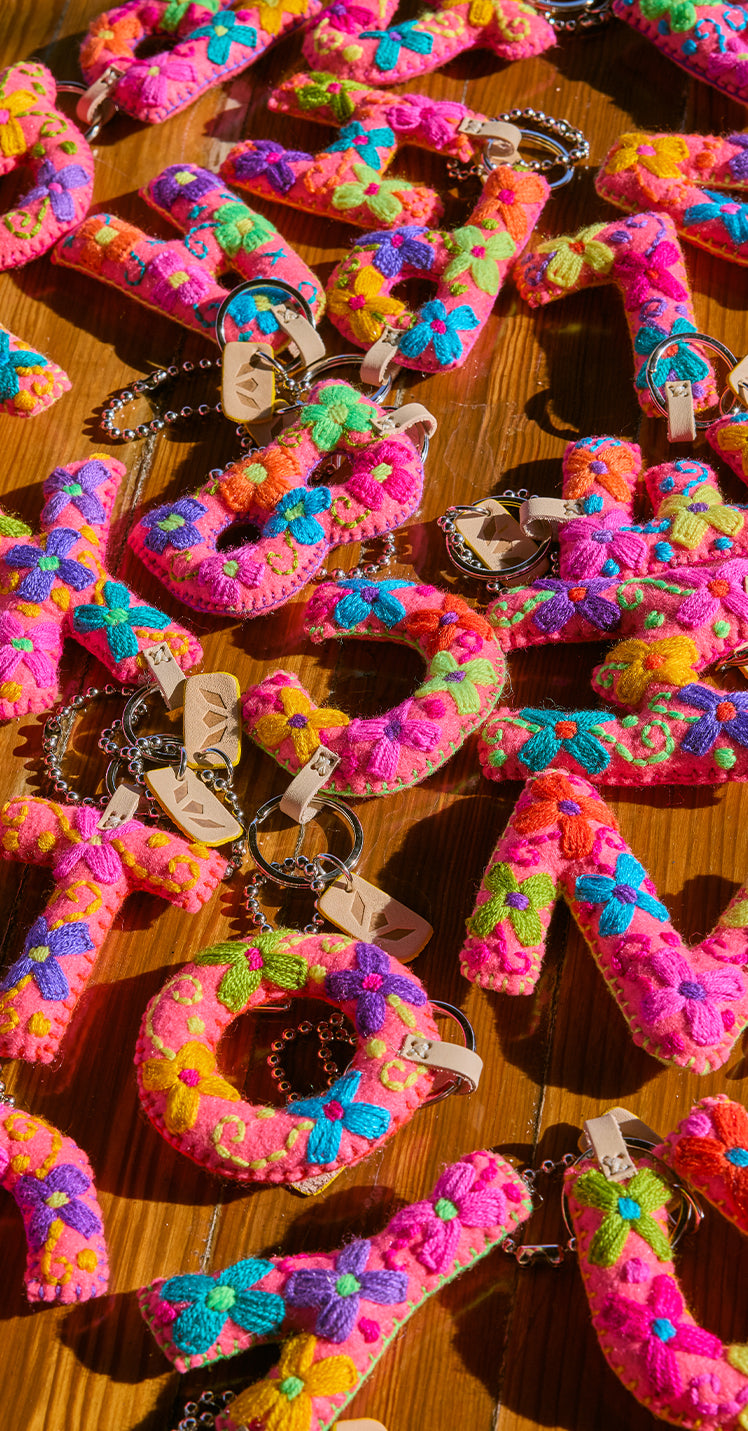 - Hand-embroidered pink felt letter charm (colors may vary)