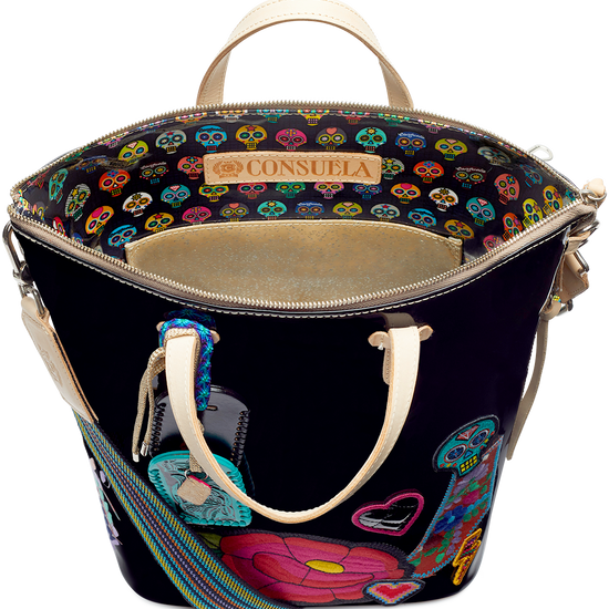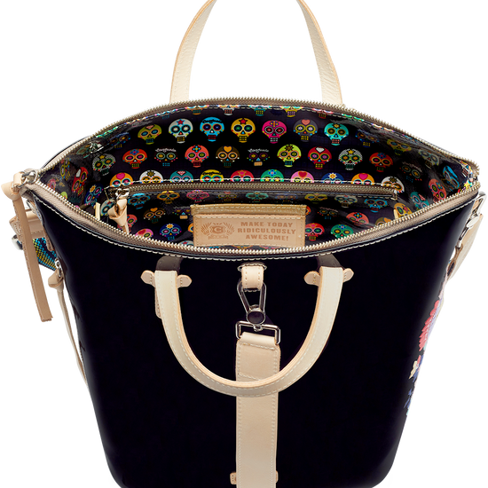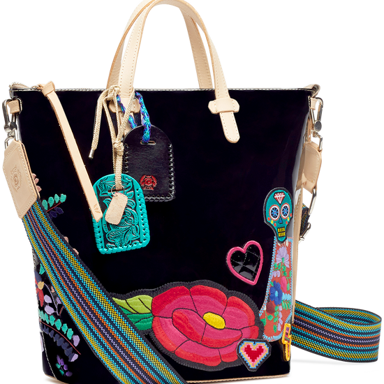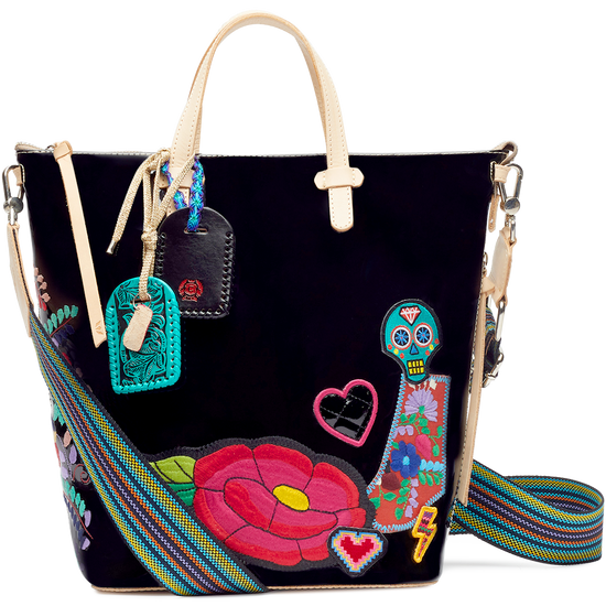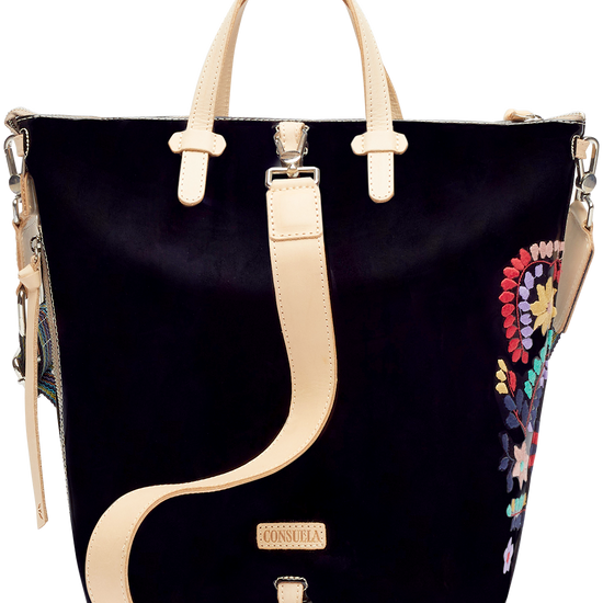 - Includes two hand-painted leather bag tags with whipstitch detailing