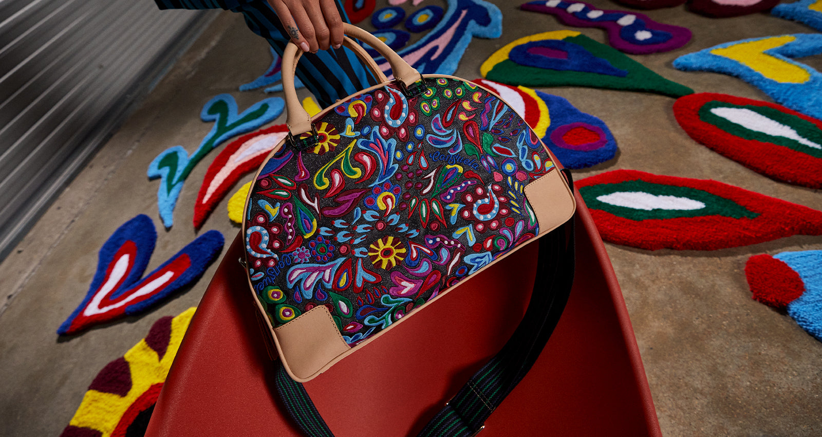 - Natural leather handles and multicolored, woven, adjustable crossbody strap