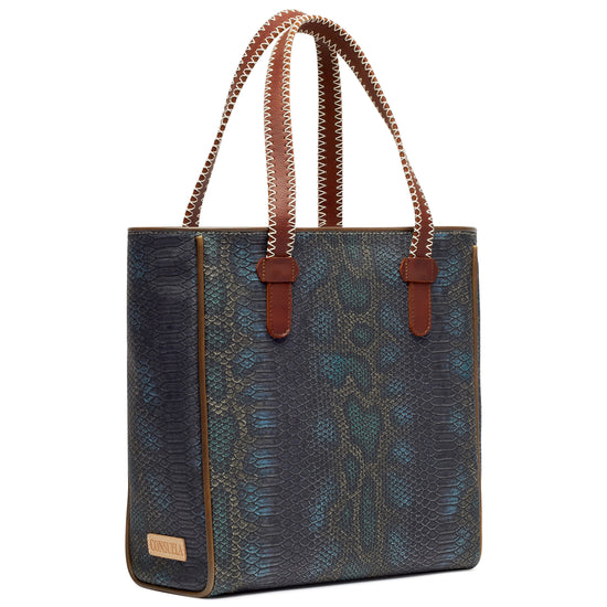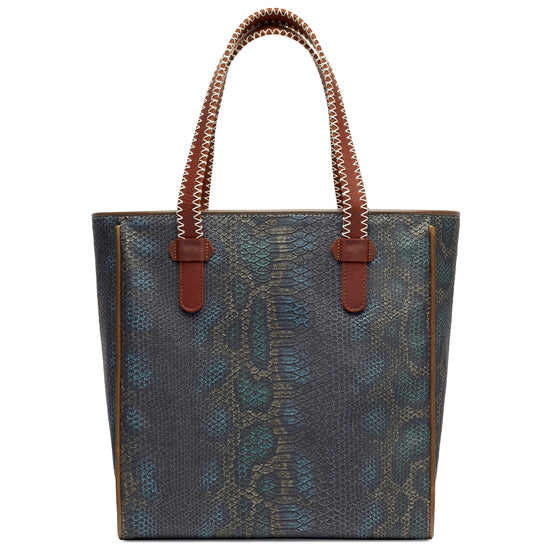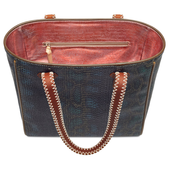 Our Rattler Classic Tote is perfect for life-on-the-go and it packs a statement in Rattler embossed snake print material. Topped with our detailed leather handles, this multi-functional tote is trimmed in leather and crafted to hold its shape. Our tote features a roomy interior and pockets; ideal for carrying your laptop, keys, and phone.