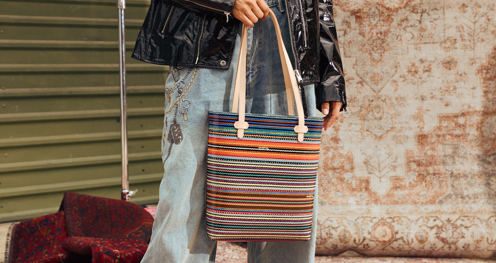 - Includes detachable and adjustable woven crossbody strap