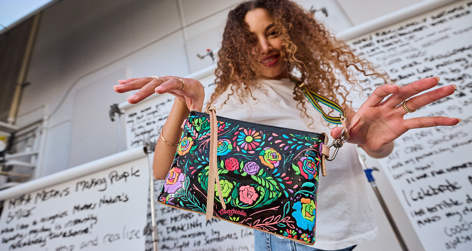 - Includes detachable and adjustable woven crossbody strap
