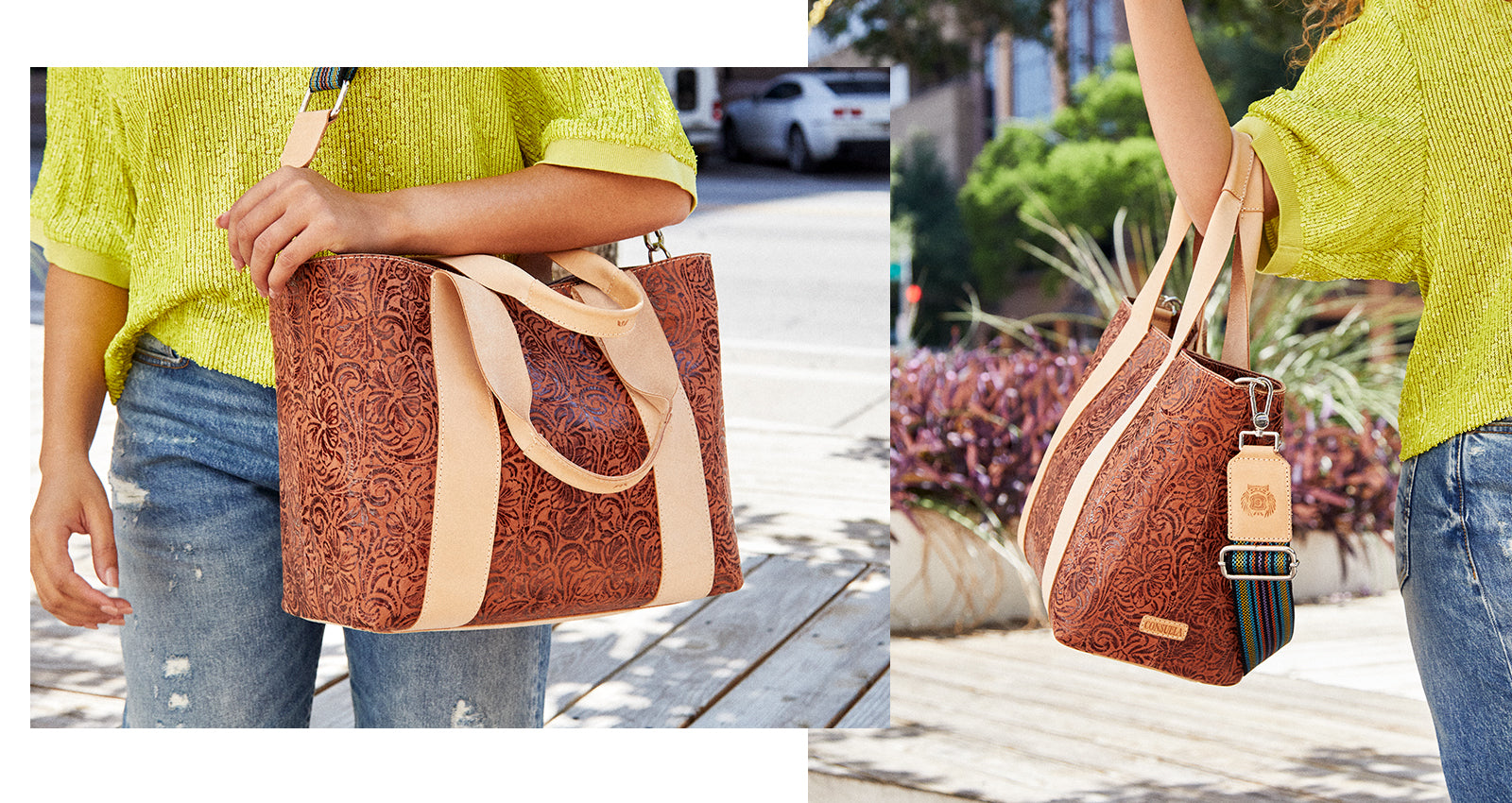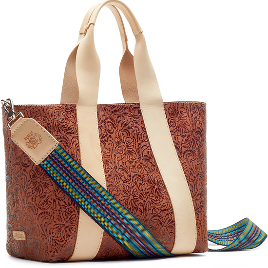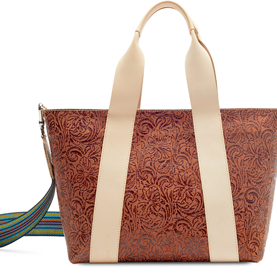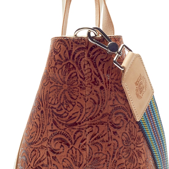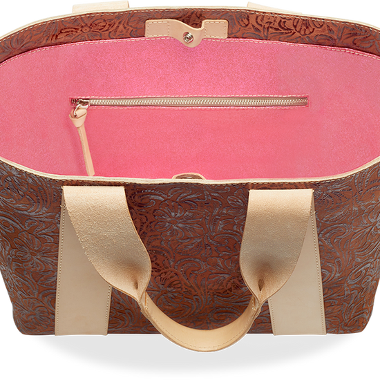 Our Sally Carryall was crafted with versatility in mind. Roomy enough for the farmer's market or the gym, our Carryall is up for anything. This tote features our Sally tooled leather exterior, interior pockets, comfortable leather handles, and our signature adjustable woven straps.