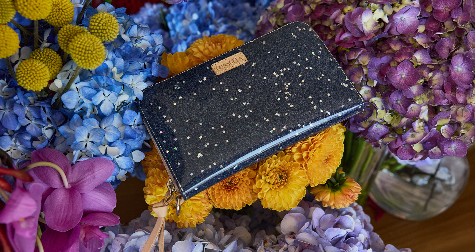 Function and versatility in the palm of your hand. Our new Essential Wallet is a streamlined, large capacity wallet with tons of room for cards, cash, and receipts — plus a zippered center compartment for coins and keepsakes. We added a D-ring so you can easily clip it to any Consuela wristlet strap or anchor onto an inside lanyard for added security.