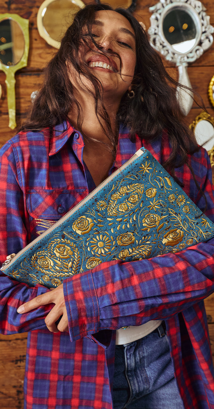 The Take Me Out Clutch was made to stand out! This unique pouch can be carried as a colorful clutch or stashed in a larger bag for stylish organization. This embroidered zipper pouch is large enough to fit most tablets, notebooks, and up to a 12” laptop.