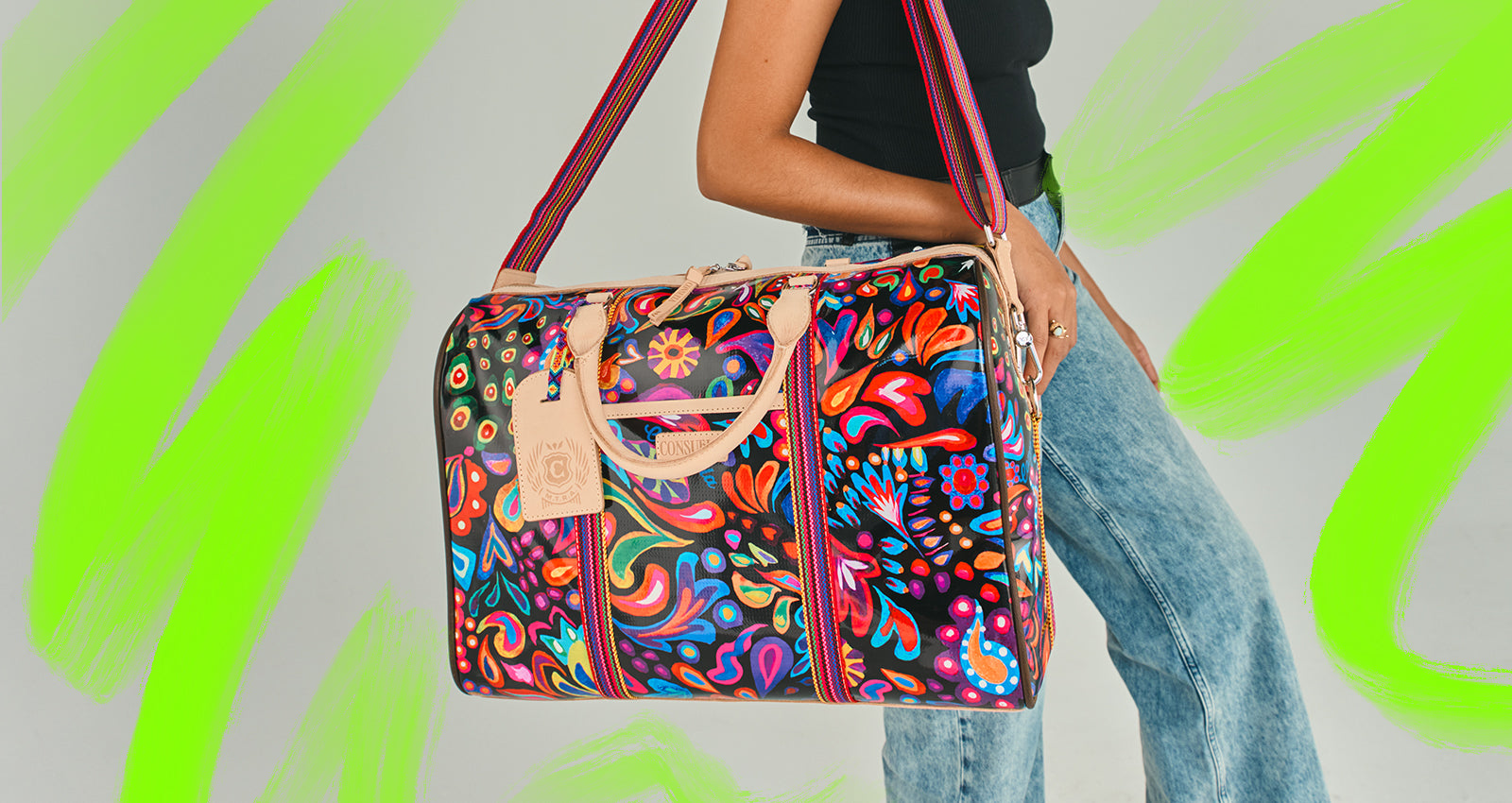 - Natural leather handles and multicolored, woven, adjustable crossbody shoulder strap