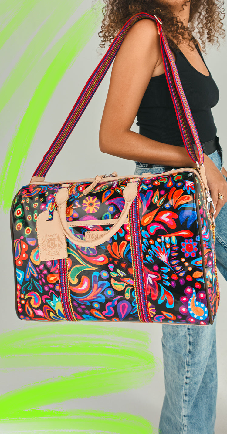This spacious and colorful duffel is the perfect carry-on for a weekend getaway, making a statement with functionality, durability, and style. Topped with natural leather handles and an adjustable webbing strap, the Jetsetter is crafted to hold its shape and makes traveling easy with ample interior storage and functional pockets.