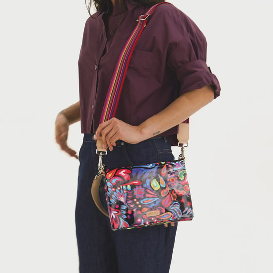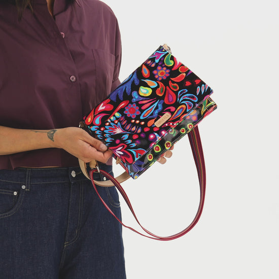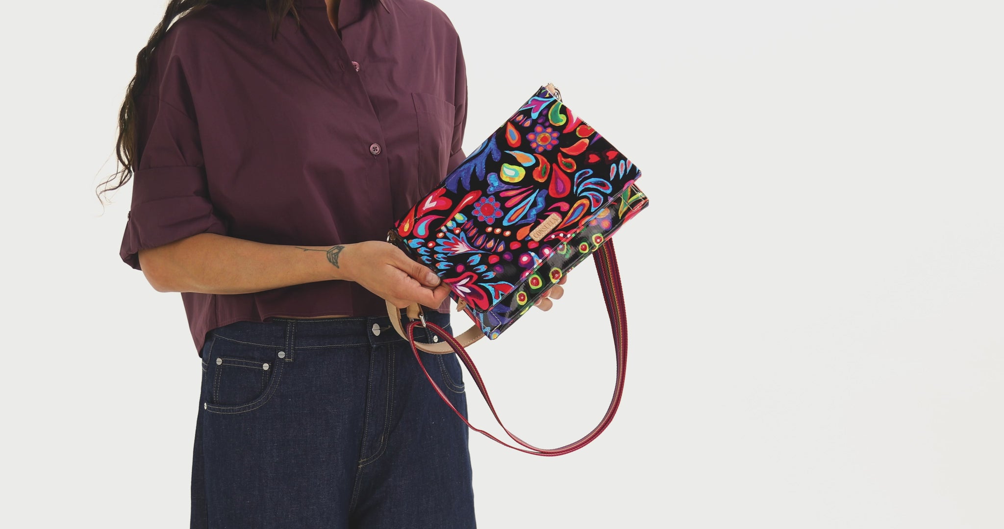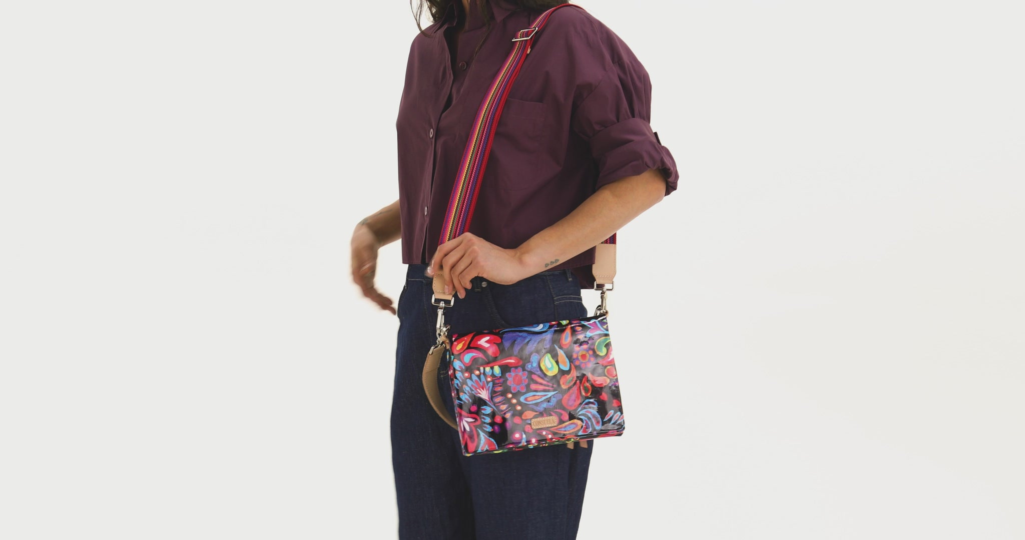 - Included detachable shoulder strap and adjustable woven crossbody strap