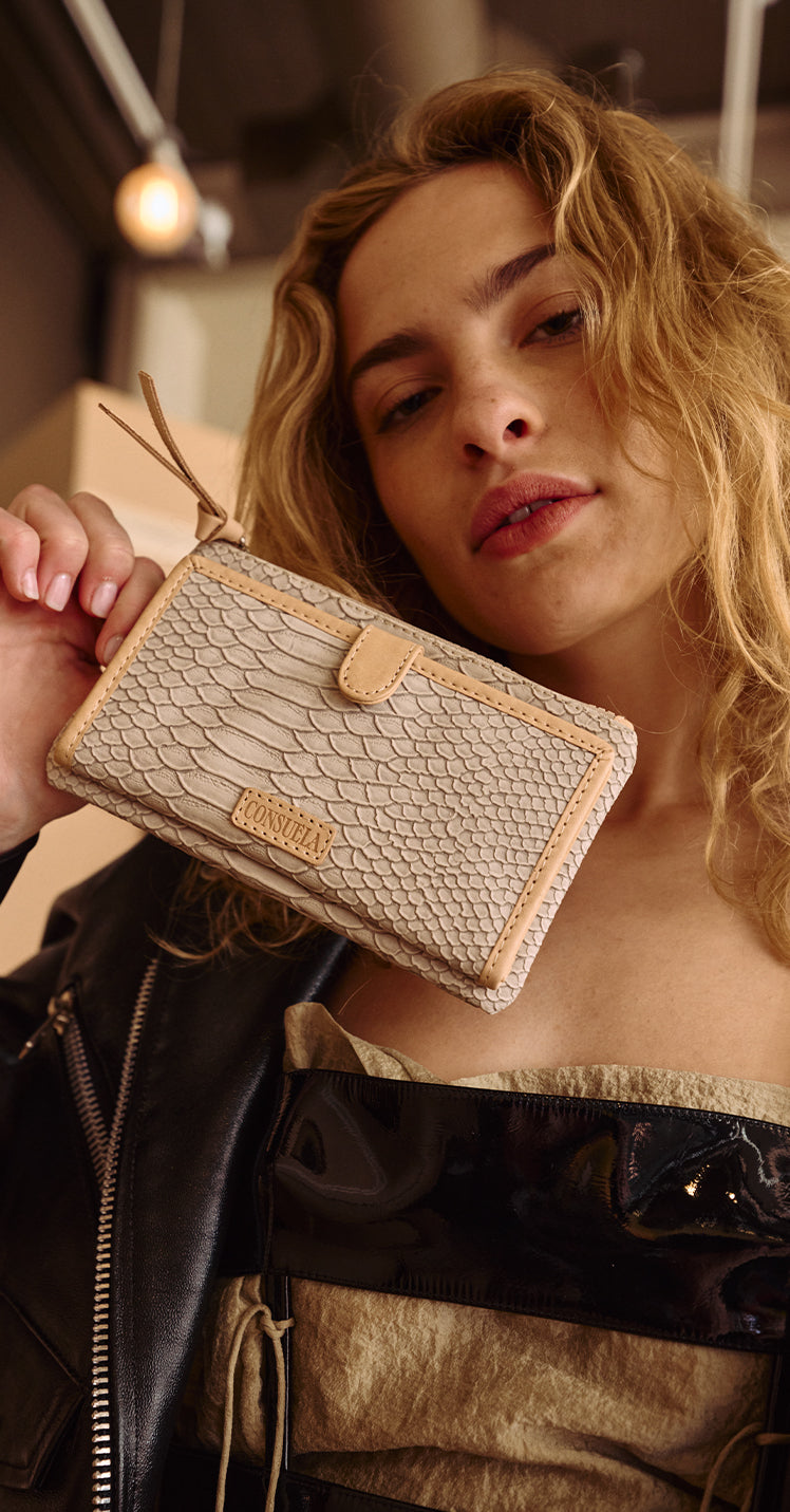 Our Slim Wallet carries cards and cash without weighing you down. Open the snap closure to reveal an ID window pocket, 12 card slots, and 4 slide pocket compartments in this versatile and colorful wallet.