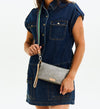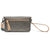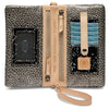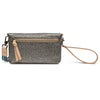 - Included detachable wristlet strap and adjustable woven crossbody strap